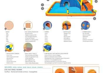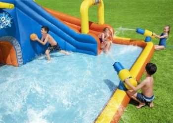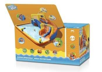Ready, set, splash! Race the day away with the H2OGO!® Super Speedway™ Mega Water Park. From start to finish, this giant inflatable park brings the racetrack to your backyard. The double climbing wall leads to 2 curved slides, which have a spontaneous dump bucket at the top that will randomly soak the kids as they race. At the bottom of the slide, there is a giant splash pool with 2 point ‘n spray water blasters. Plus, there are even more games for kids to play – a ball hoop with a basketball and a tunnel to adventure through. Kids will be racing and playing in no time, because the included blower inflates this entire giant water park in just 2 minutes! The park is constructed of double-stitched, PVC-coated polyester material that is super durable and provides a comfortable feel and touch for kids, keeping the fun splashing year after year. Kids can splash and race their way through summer with the H2OGO! Super Speedway Inflatable Water Park!