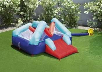 2.50m x 2.10m x 1.52m /8ā2ā x 6ā10ā x 5ā Durable, colorful, PVC coated polyester material Quick setup system (inflated in less than 2 minutes) Mesh walls for safety and visibility for parents Extra-sturdy slide construction Full color box Designed for outdoor and indoor use Contents: 1 bouncer, 1 blower, 1 repair kit (multiple assorted patches), 1 storage bag, 9 bouncer stakes